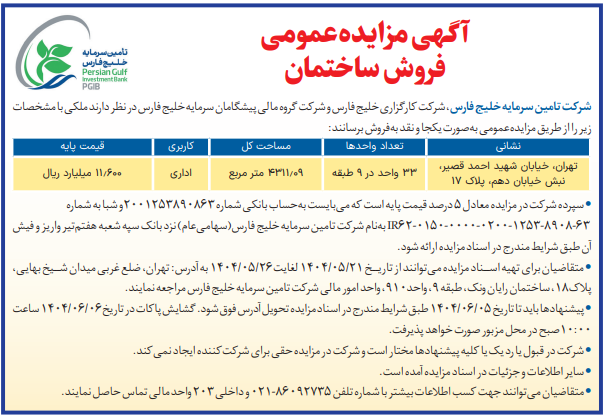 | شرح فرآيند مزايده طبق مصوبه هیئت مدیره، شرکت تامین سرمایه خلیج فارس( سهامی عام) به شماره ثبت 592365 و شناسه ملی 14010836281 در نظر دارد ملکی را با مالکیت مشترک (لازم به توضیح است که 52.24 درصد سهم مالکیت شرکت تامین سرمایه خلیج فارس می باشد) با شرکت کارگزاری خلیج فارس و شرکت گروه مالی پیشگامان خلیج فارس طبق مشخصات قید شده درآگهی مزایده پیوست به فروش برساند. متقاضیان جهت شرکت در مزایده و دریافت پاکات مربوطه از تاریخ 1404/05/21 لغایت 1404/05/26 در ساعات اداری به جز روزهای 5شنبه و جمعه از ساعت 9 الی 16 به نشانی تهران ضلع غربی میدان شیخ بهایی، پلاک18، ساختمان رایان ونک طبقه 9 واحد 910 واحد امور مالی شرکت تامین سرمایه مراجعه فرمایند. |