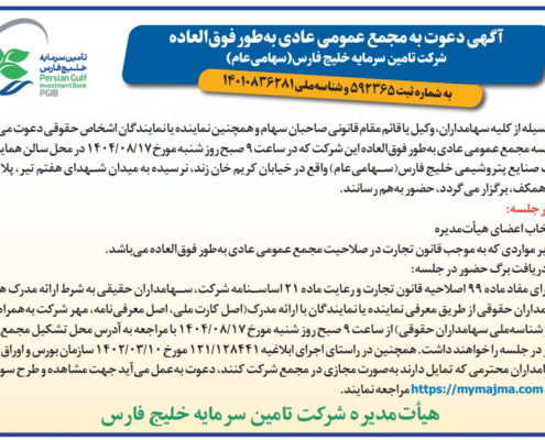 آگهی دعوت به مجمع عمومی عادی به طور فوقالعاده شرکت تامین سرمایه خلیج فارس